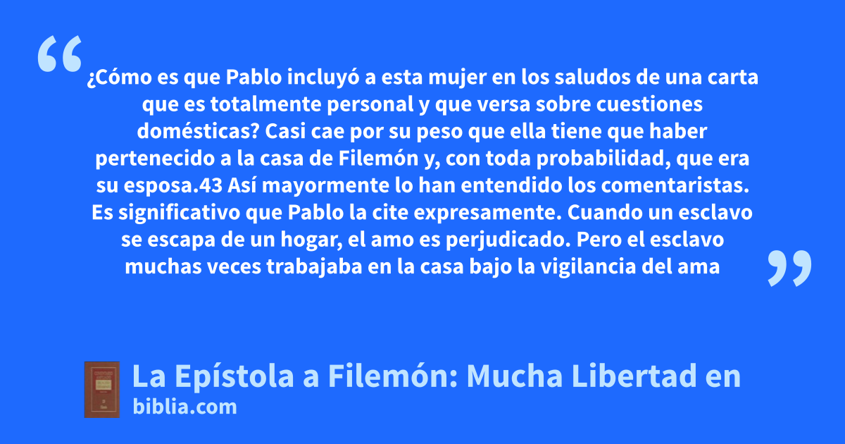 ¿Cómo es que Pablo incluyó a esta mujer en los saludos de una carta que es totalmente personal y que versa sobre cuestiones domésticas? Casi cae por su peso que ella tiene que haber pertenecido a la casa de Filemón y, con toda probabilidad, que era su esposa.43 Así mayormente lo han entendido los comentaristas. Es significativo que Pablo la cite expresamente. Cuando un esclavo se escapa de un hogar, el amo es perjudicado. Pero el esclavo muchas veces trabajaba en la casa bajo la vigilancia del ama