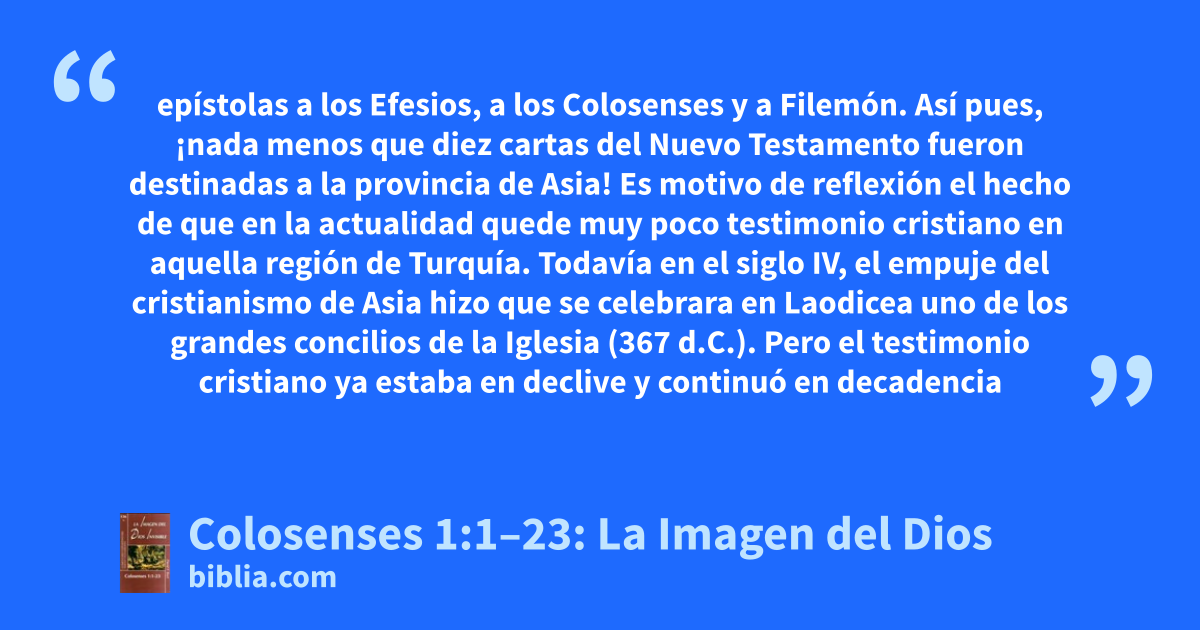 epístolas a los Efesios, a los Colosenses y a Filemón. Así pues, ¡nada menos que diez cartas del Nuevo Testamento fueron destinadas a la provincia de Asia! Es motivo de reflexión el hecho de que en la actualidad quede muy poco testimonio cristiano en aquella región de Turquía. Todavía en el siglo IV, el empuje del cristianismo de Asia hizo que se celebrara en Laodicea uno de los grandes concilios de la Iglesia (367 d.C.). Pero el testimonio cristiano ya estaba en declive y continuó en decadencia
