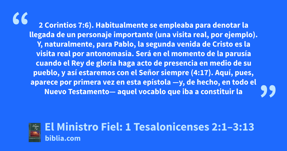 2 Corintios 7:6). Habitualmente se empleaba para denotar la llegada de un personaje importante (una visita real, por ejemplo). Y, naturalmente, para Pablo, la segunda venida de Cristo es la visita real por antonomasia. Será en el momento de la parusía cuando el Rey de gloria haga acto de presencia en medio de su pueblo, y así estaremos con el Señor siempre (4:17). Aquí, pues, aparece por primera vez en esta epístola —y, de hecho, en todo el Nuevo Testamento— aquel vocablo que iba a constituir la