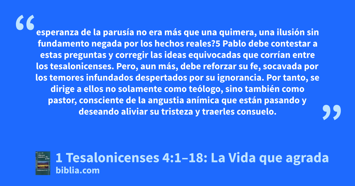 esperanza de la parusía no era más que una quimera, una ilusión sin fundamento negada por los hechos reales?5 Pablo debe contestar a estas preguntas y corregir las ideas equivocadas que corrían entre los tesalonicenses. Pero, aun más, debe reforzar su fe, socavada por los temores infundados despertados por su ignorancia. Por tanto, se dirige a ellos no solamente como teólogo, sino también como pastor, consciente de la angustia anímica que están pasando y deseando aliviar su tristeza y traerles consuelo.