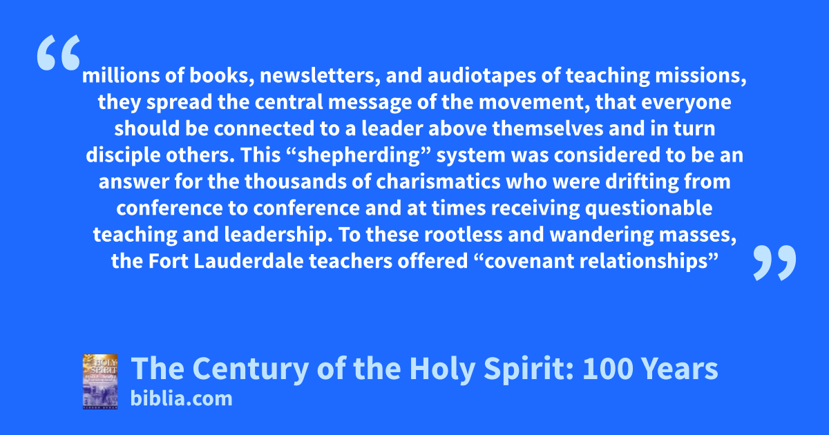 millions of books, newsletters, and audiotapes of teaching missions, they spread the central message of the movement, that everyone should be connected to a leader above themselves and in turn disciple others. This “shepherding” system was considered to be an answer for the thousands of charismatics who were drifting from conference to conference and at times receiving questionable teaching and leadership. To these rootless and wandering masses, the Fort Lauderdale teachers offered “covenant relationships”