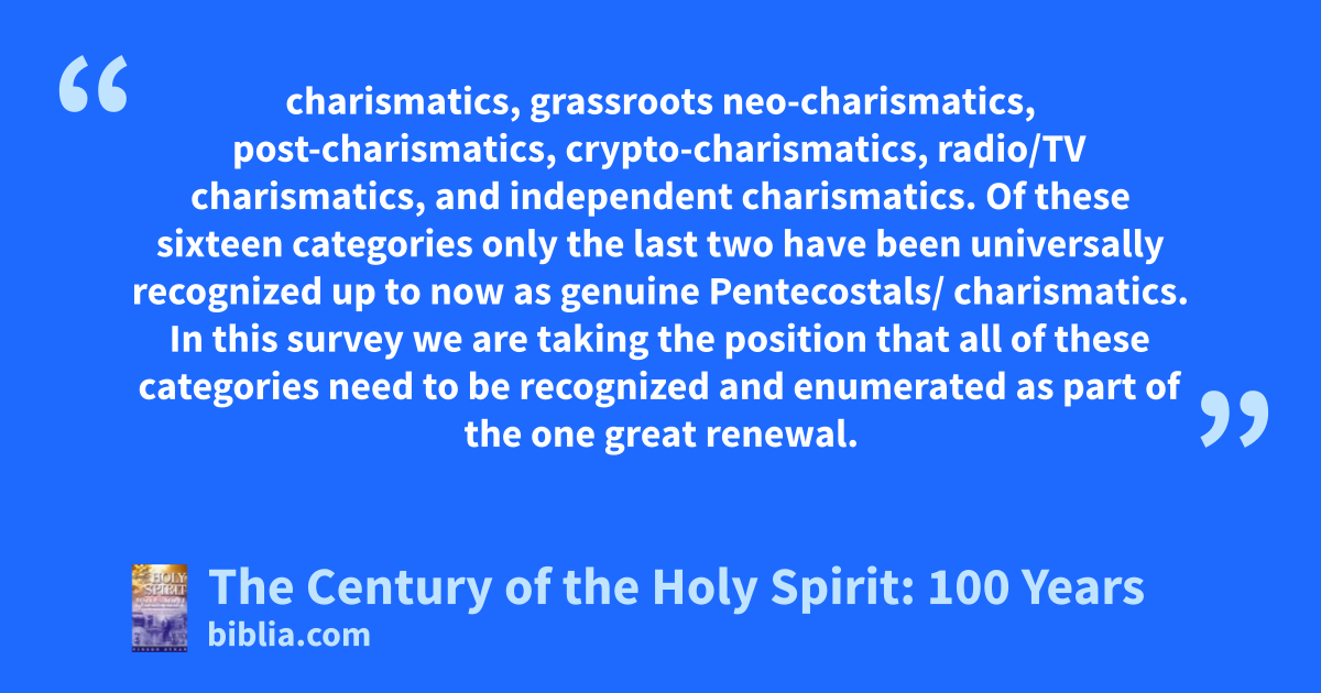 charismatics, grassroots neo-charismatics, post-charismatics, crypto-charismatics, radio/TV charismatics, and independent charismatics. Of these sixteen categories only the last two have been universally recognized up to now as genuine Pentecostals/ charismatics. In this survey we are taking the position that all of these categories need to be recognized and enumerated as part of the one great renewal.