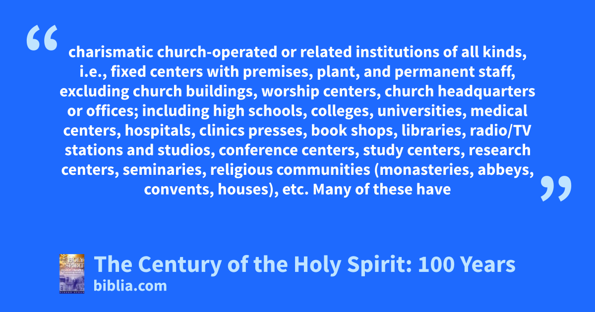 charismatic church-operated or related institutions of all kinds, i.e., fixed centers with premises, plant, and permanent staff, excluding church buildings, worship centers, church headquarters or offices; including high schools, colleges, universities, medical centers, hospitals, clinics presses, book shops, libraries, radio/TV stations and studios, conference centers, study centers, research centers, seminaries, religious communities (monasteries, abbeys, convents, houses), etc. Many of these have