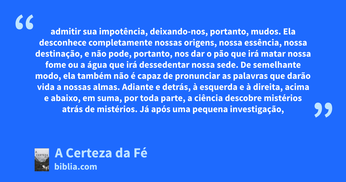 admitir sua impotência, deixando-nos, portanto, mudos. Ela desconhece completamente nossas origens, nossa essência, nossa destinação, e não pode, portanto, nos dar o pão que irá matar nossa fome ou a água que irá dessedentar nossa sede. De semelhante modo, ela também não é capaz de pronunciar as palavras que darão vida a nossas almas. Adiante e detrás, à esquerda e à direita, acima e abaixo, em suma, por toda parte, a ciência descobre mistérios atrás de mistérios. Já após uma pequena investigação,