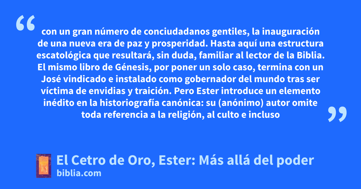 El Cetro de Oro El libro de Ester contiene un mensaje asombrosamente relevante para el mundo de hoy. Marginado históricamente a causa de las dificultades que presenta para el lector cristiano, entre ellas la ausencia de todo mención de Dios, Ester plantea a través de un estilo narrativo rico y sugerente temas de gran actualidad: la relación entre el hombre y la mujer, la lucha por el poder, los...
