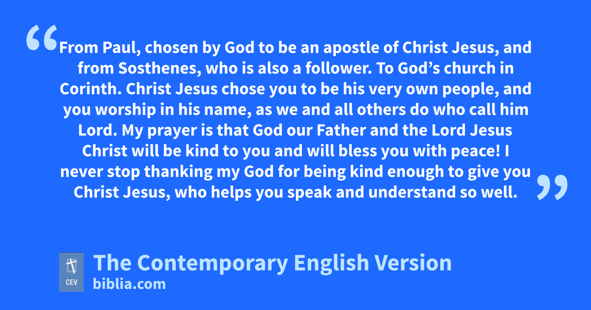 From Paul, chosen by God to be an apostle of Christ Jesus, and from Sosthenes, who is also a follower. To God’s church in Corinth. Christ Jesus chose you to be his very own people, and you worship in his name, as we and all others do who call him Lord. My prayer is that God our Father and the Lord Jesus Christ will be kind to you and will bless you with peace! I never stop thanking my God for being kind enough to give you Christ Jesus, who helps you speak and understand so well.