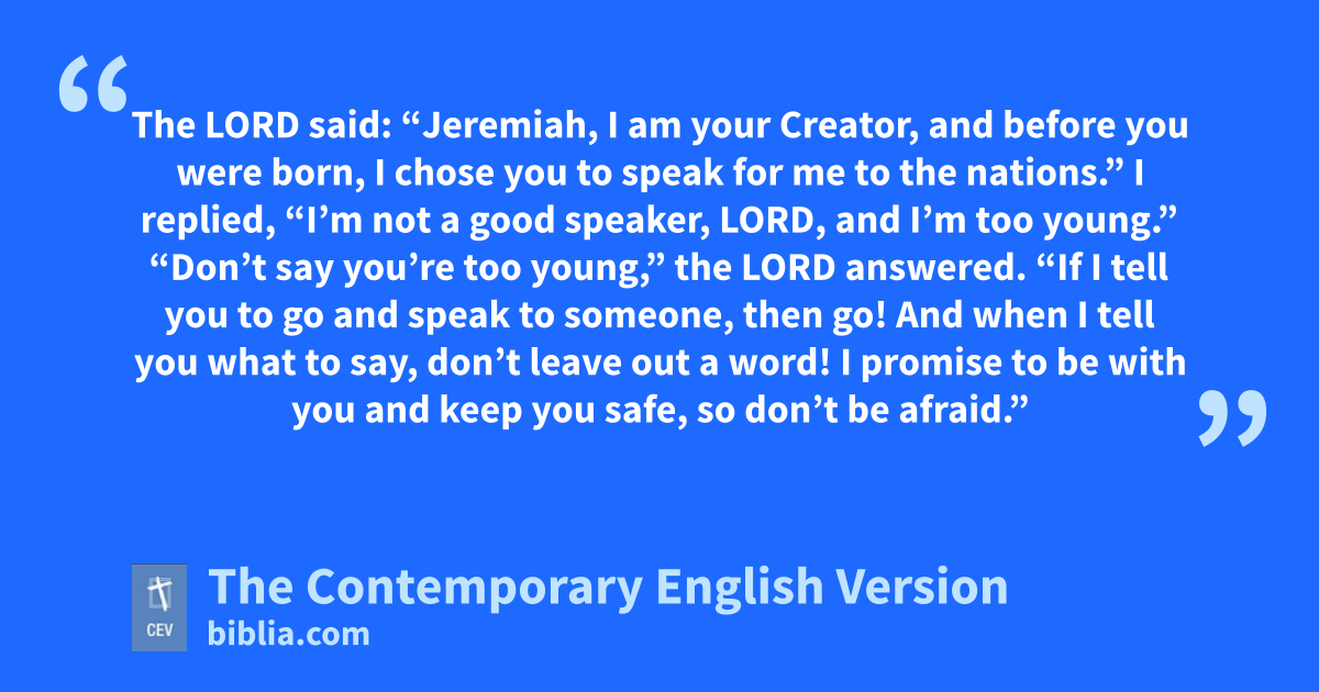 The LORD said: “Jeremiah, I am your Creator, and before you were born, I chose you to speak for me to the nations.” I replied, “I’m not a good speaker, LORD, and I’m too young.” “Don’t say you’re too young,” the LORD answered. “If I tell you to go and speak to someone, then go! And when I tell you what to say, don’t leave out a word! I promise to be with you and keep you safe, so don’t be afraid.”