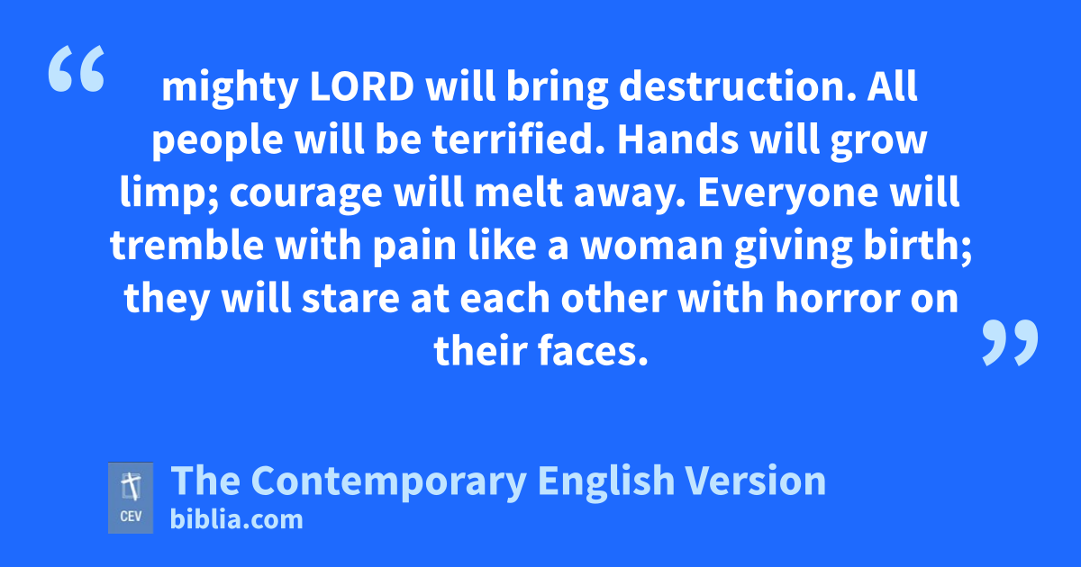 mighty LORD will bring destruction. All people will be terrified. Hands will grow limp; courage will melt away. Everyone will tremble with pain like a woman giving birth; they will stare at each other with horror on their faces.
