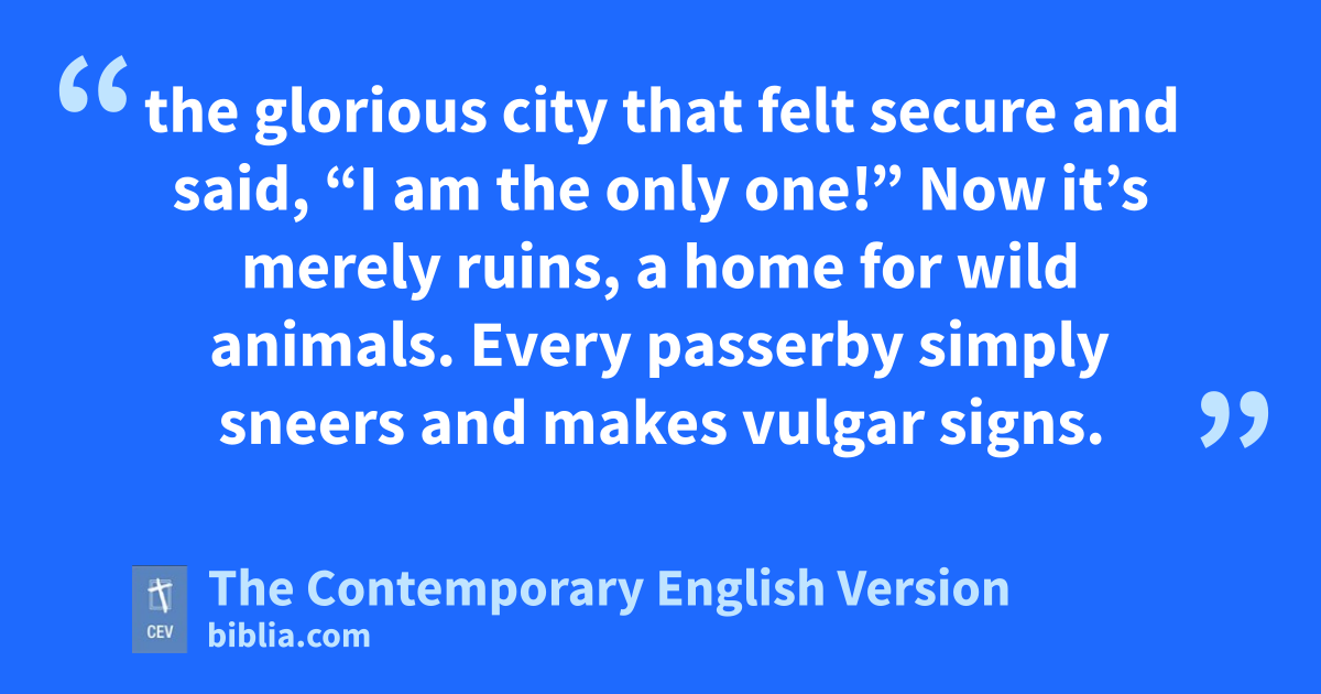 the glorious city that felt secure and said, “I am the only one!” Now it’s merely ruins, a home for wild animals. Every passerby simply sneers and makes vulgar signs.