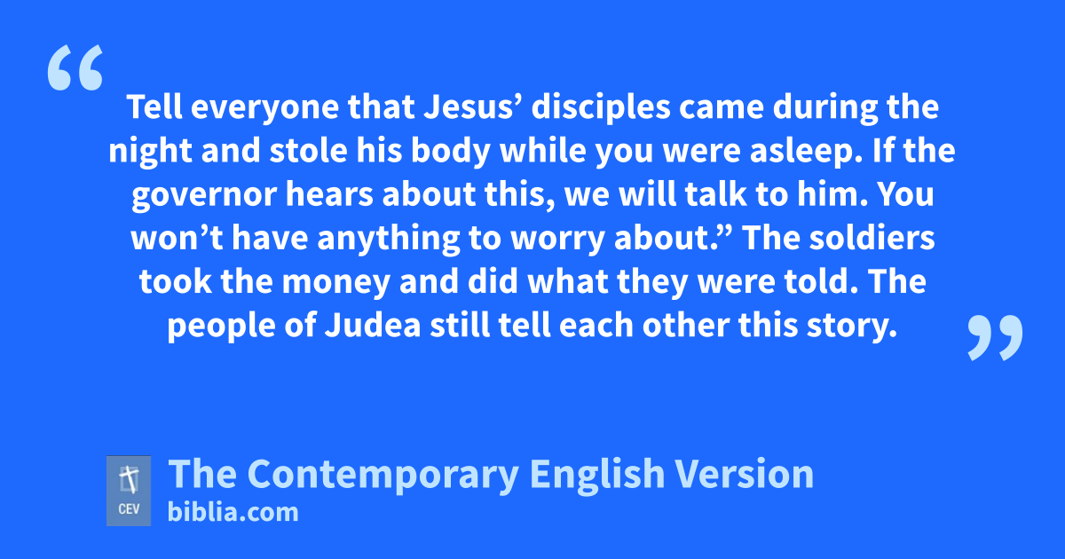 Tell everyone that Jesus’ disciples came during the night and stole his body while you were asleep. If the governor hears about this, we will talk to him. You won’t have anything to worry about.” The soldiers took the money and did what they were told. The people of Judea still tell each other this story.