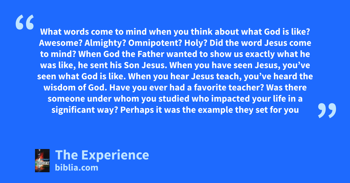 What words come to mind when you think about what God is like? Awesome? Almighty? Omnipotent? Holy? Did the word Jesus come to mind? When God the Father wanted to show us exactly what he was like, he sent his Son Jesus. When you have seen Jesus, you’ve seen what God is like. When you hear Jesus teach, you’ve heard the wisdom of God. Have you ever had a favorite teacher? Was there someone under whom you studied who impacted your life in a significant way? Perhaps it was the example they set for you