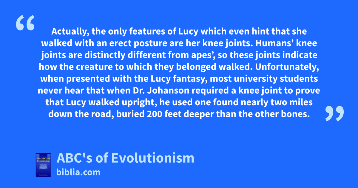 Actually, the only features of Lucy which even hint that she walked with an erect posture are her knee joints. Humans’ knee joints are distinctly different from apes’, so these joints indicate how the creature to which they belonged walked. Unfortunately, when presented with the Lucy fantasy, most university students never hear that when Dr. Johanson required a knee joint to prove that Lucy walked upright, he used one found nearly two miles down the road, buried 200 feet deeper than the other bones.