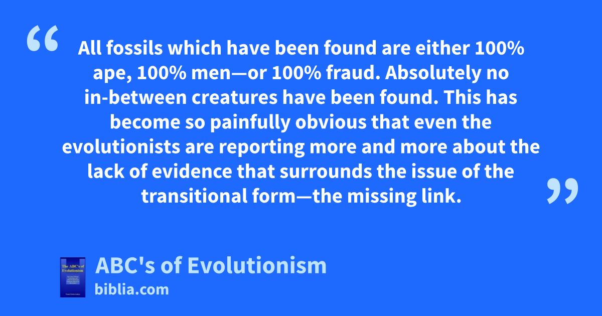 All fossils which have been found are either 100% ape, 100% men—or 100% fraud. Absolutely no in-between creatures have been found. This has become so painfully obvious that even the evolutionists are reporting more and more about the lack of evidence that surrounds the issue of the transitional form—the missing link.