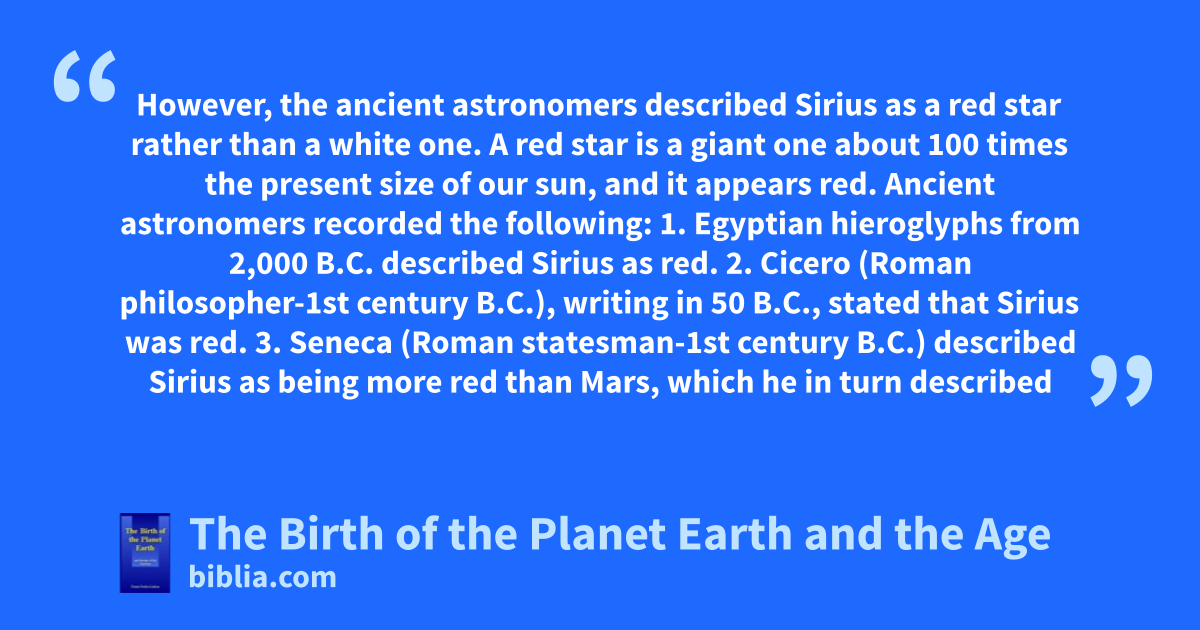 However, the ancient astronomers described Sirius as a red star rather than a white one. A red star is a giant one about 100 times the present size of our sun, and it appears red. Ancient astronomers recorded the following: 1. Egyptian hieroglyphs from 2,000 B.C. described Sirius as red. 2. Cicero (Roman philosopher-1st century B.C.), writing in 50 B.C., stated that Sirius was red. 3. Seneca (Roman statesman-1st century B.C.) described Sirius as being more red than Mars, which he in turn described