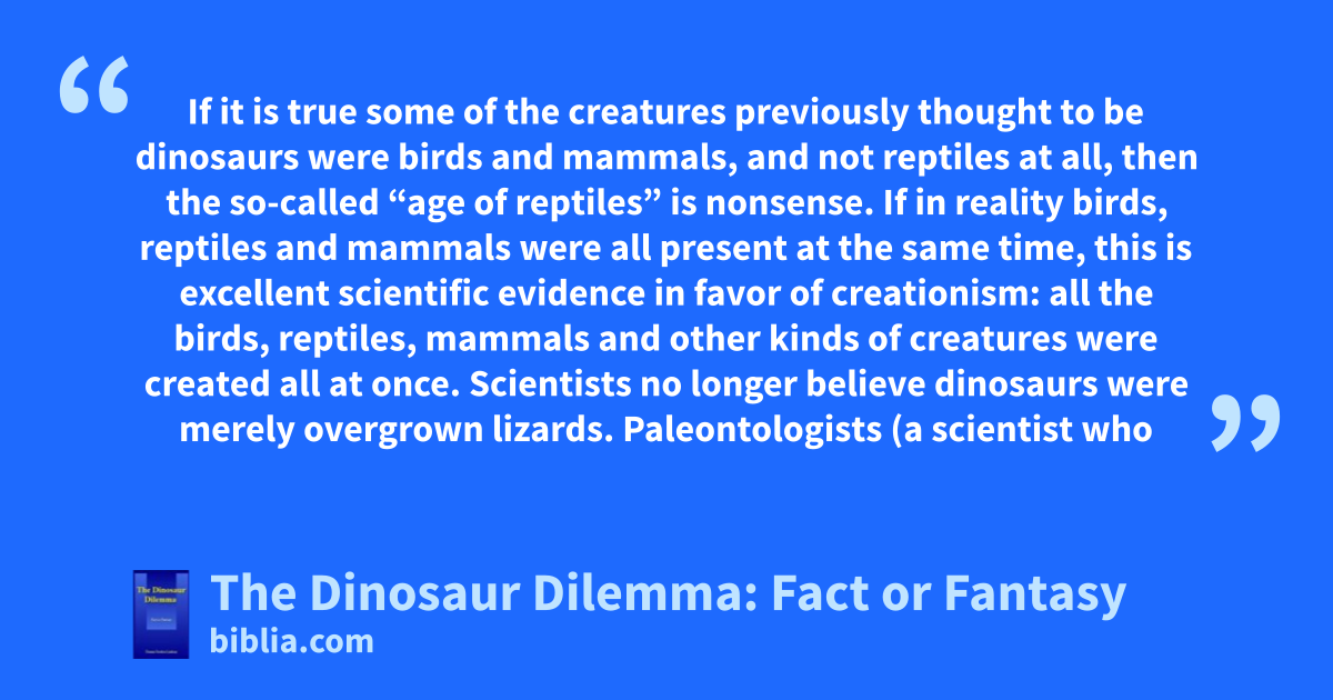 If it is true some of the creatures previously thought to be dinosaurs were birds and mammals, and not reptiles at all, then the so-called “age of reptiles” is nonsense. If in reality birds, reptiles and mammals were all present at the same time, this is excellent scientific evidence in favor of creationism: all the birds, reptiles, mammals and other kinds of creatures were created all at once. Scientists no longer believe dinosaurs were merely overgrown lizards. Paleontologists (a scientist who