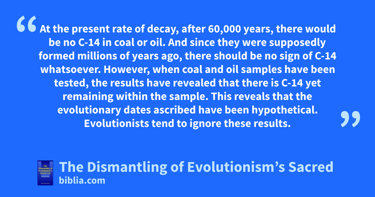 At the present rate of decay, after 60,000 years, there would be no C-14 in coal or oil. And since they were supposedly formed millions of years ago, there should be no sign of C-14 whatsoever. However, when coal and oil samples have been tested, the results have revealed that there is C-14 yet remaining within the sample. This reveals that the evolutionary dates ascribed have been hypothetical. Evolutionists tend to ignore these results.