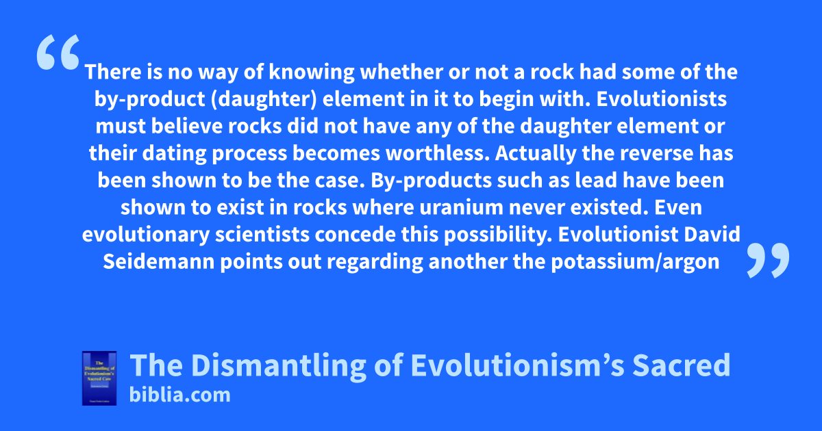 There is no way of knowing whether or not a rock had some of the by-product (daughter) element in it to begin with. Evolutionists must believe rocks did not have any of the daughter element or their dating process becomes worthless. Actually the reverse has been shown to be the case. By-products such as lead have been shown to exist in rocks where uranium never existed. Even evolutionary scientists concede this possibility. Evolutionist David Seidemann points out regarding another the potassium/argon