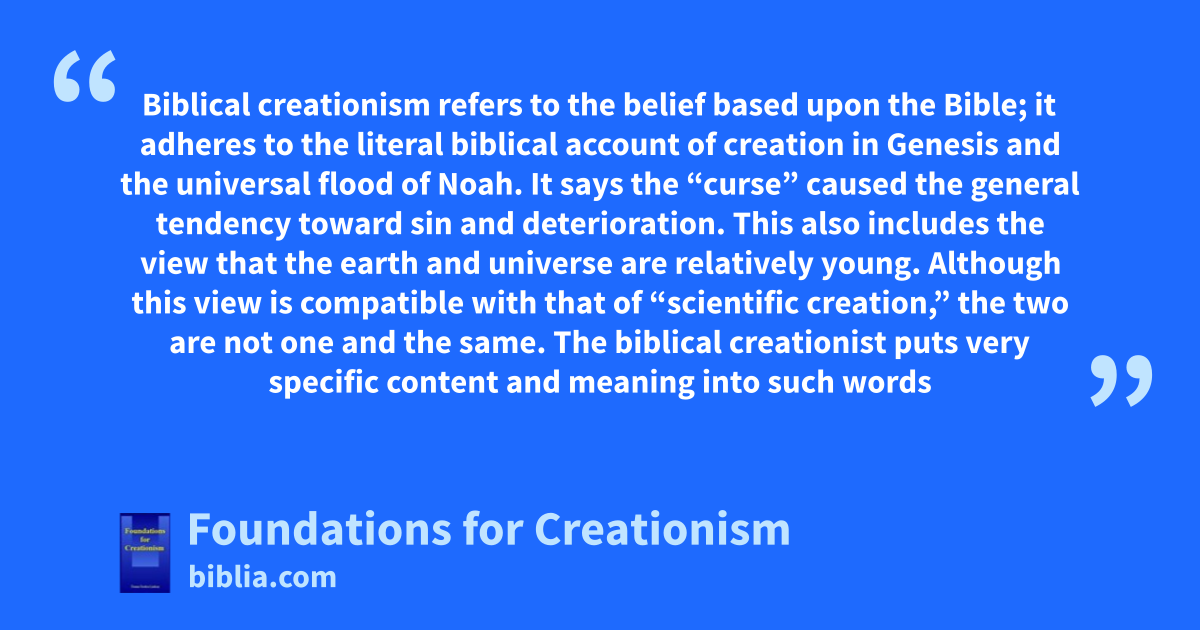 Biblical creationism refers to the belief based upon the Bible; it adheres to the literal biblical account of creation in Genesis and the universal flood of Noah. It says the “curse” caused the general tendency toward sin and deterioration. This also includes the view that the earth and universe are relatively young. Although this view is compatible with that of “scientific creation,” the two are not one and the same. The biblical creationist puts very specific content and meaning into such words