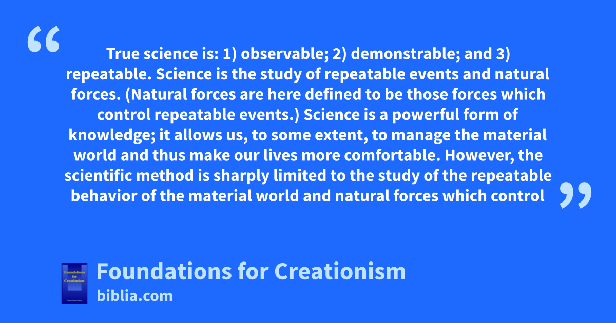 True science is: 1) observable; 2) demonstrable; and 3) repeatable. Science is the study of repeatable events and natural forces. (Natural forces are here defined to be those forces which control repeatable events.) Science is a powerful form of knowledge; it allows us, to some extent, to manage the material world and thus make our lives more comfortable. However, the scientific method is sharply limited to the study of the repeatable behavior of the material world and natural forces which control
