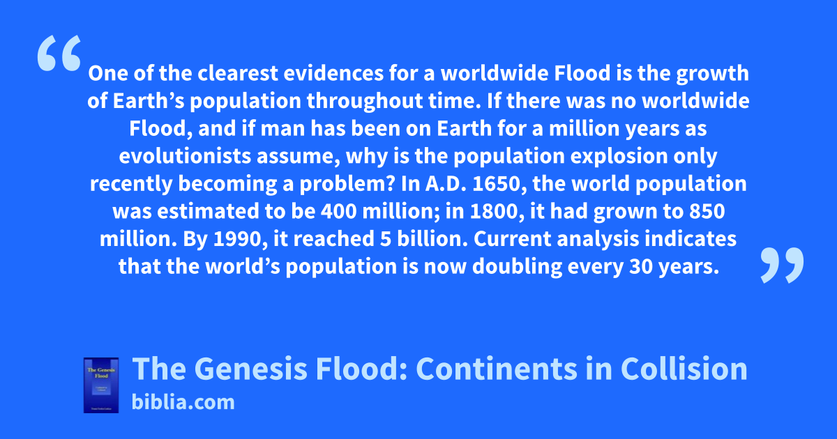 One of the clearest evidences for a worldwide Flood is the growth of Earth’s population throughout time. If there was no worldwide Flood, and if man has been on Earth for a million years as evolutionists assume, why is the population explosion only recently becoming a problem? In A.D. 1650, the world population was estimated to be 400 million; in 1800, it had grown to 850 million. By 1990, it reached 5 billion. Current analysis indicates that the world’s population is now doubling every 30 years.