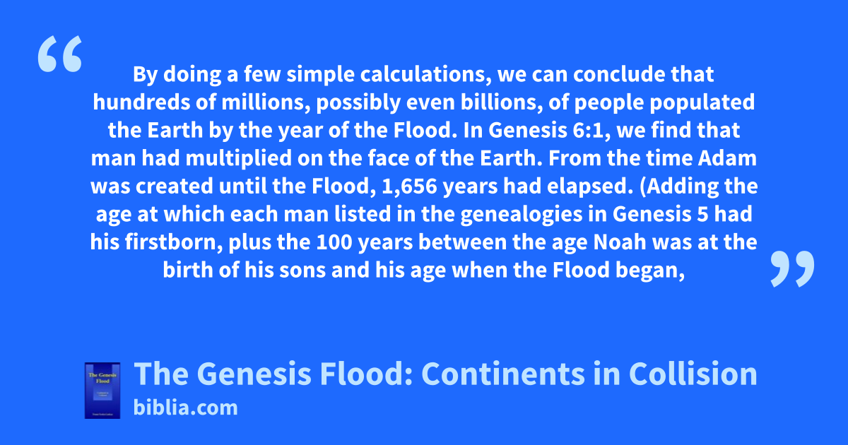 By doing a few simple calculations, we can conclude that hundreds of millions, possibly even billions, of people populated the Earth by the year of the Flood. In Genesis 6:1, we find that man had multiplied on the face of the Earth. From the time Adam was created until the Flood, 1,656 years had elapsed. (Adding the age at which each man listed in the genealogies in Genesis 5 had his firstborn, plus the 100 years between the age Noah was at the birth of his sons and his age when the Flood began,