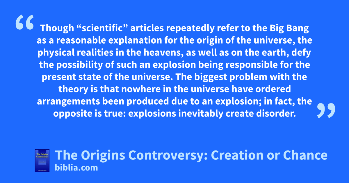 Though “scientific” articles repeatedly refer to the Big Bang as a reasonable explanation for the origin of the universe, the physical realities in the heavens, as well as on the earth, defy the possibility of such an explosion being responsible for the present state of the universe. The biggest problem with the theory is that nowhere in the universe have ordered arrangements been produced due to an explosion; in fact, the opposite is true: explosions inevitably create disorder.
