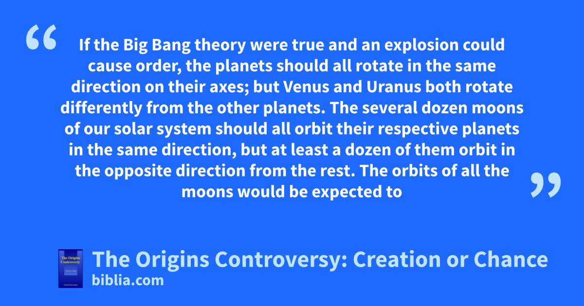 If the Big Bang theory were true and an explosion could cause order, the planets should all rotate in the same direction on their axes; but Venus and Uranus both rotate differently from the other planets. The several dozen moons of our solar system should all orbit their respective planets in the same direction, but at least a dozen of them orbit in the opposite direction from the rest. The orbits of all the moons would be expected to