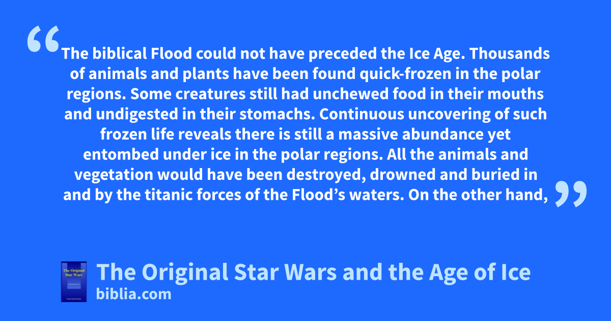 The biblical Flood could not have preceded the Ice Age. Thousands of animals and plants have been found quick-frozen in the polar regions. Some creatures still had unchewed food in their mouths and undigested in their stomachs. Continuous uncovering of such frozen life reveals there is still a massive abundance yet entombed under ice in the polar regions. All the animals and vegetation would have been destroyed, drowned and buried in and by the titanic forces of the Flood’s waters. On the other hand,
