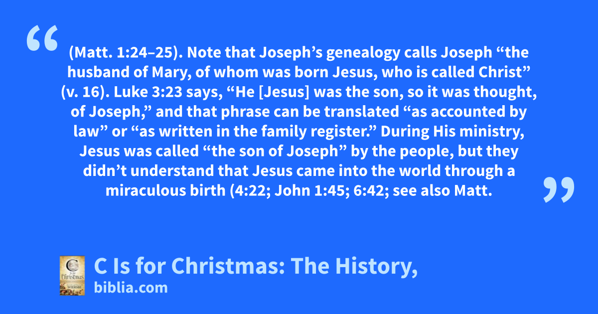 (Matt. 1:24–25). Note that Joseph’s genealogy calls Joseph “the husband of Mary, of whom was born Jesus, who is called Christ” (v. 16). Luke 3:23 says, “He [Jesus] was the son, so it was thought, of Joseph,” and that phrase can be translated “as accounted by law” or “as written in the family register.” During His ministry, Jesus was called “the son of Joseph” by the people, but they didn’t understand that Jesus came into the world through a miraculous birth (4:22; John 1:45; 6:42; see also Matt.