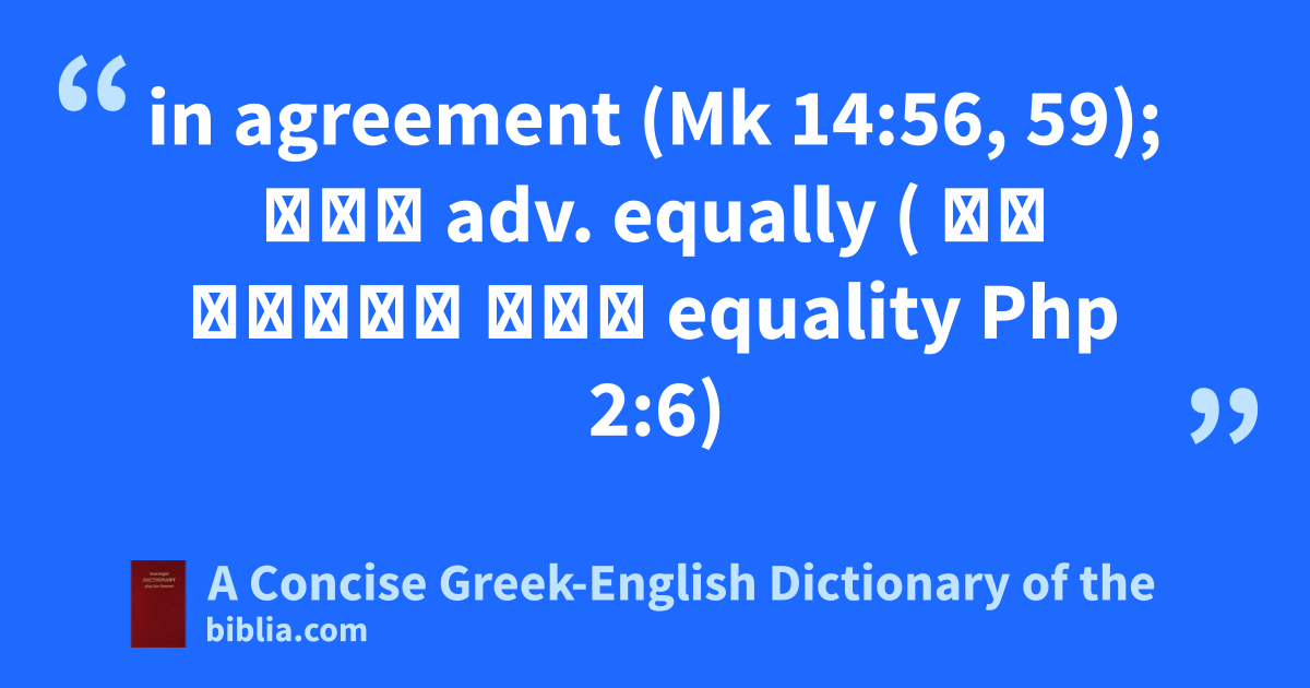 in agreement (Mk 14:56, 59); ἴσα adv. equally ( τὸ εἶναι ἴσα equality Php 2:6)