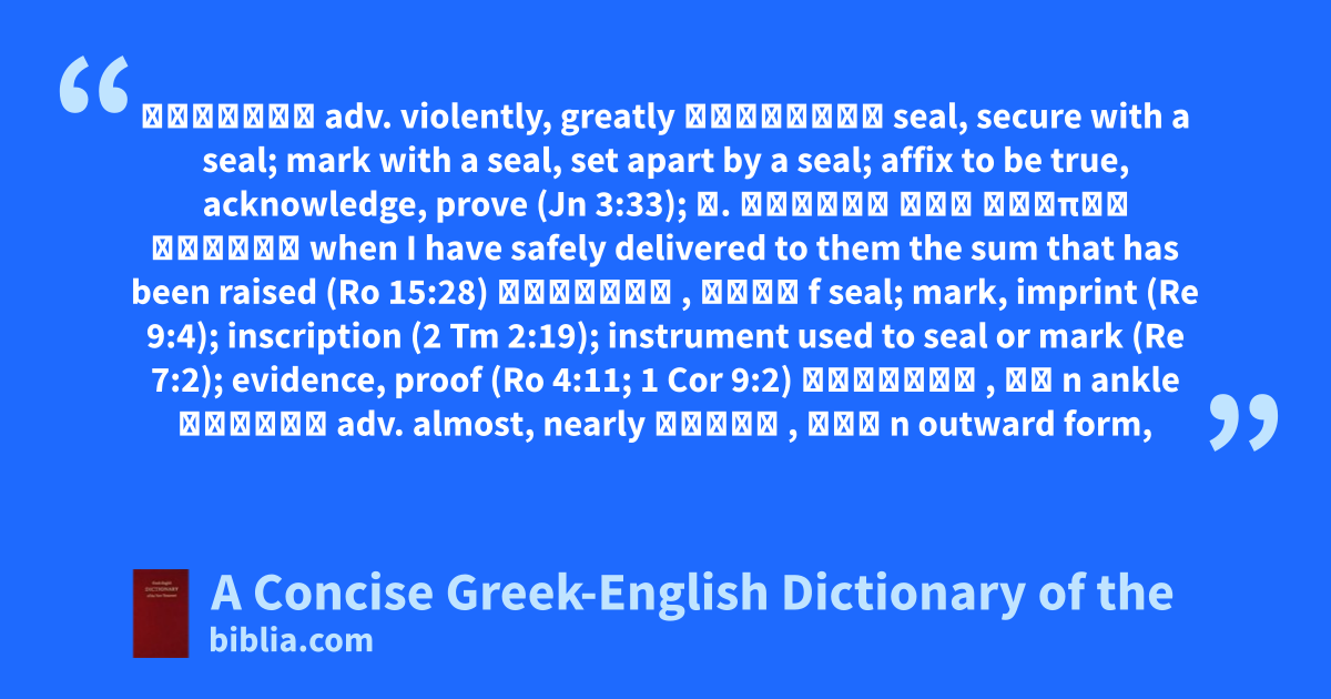 σφοδρῶς adv. violently, greatly σφραγίζω seal, secure with a seal; mark with a seal, set apart by a seal; affix to be true, acknowledge, prove (Jn 3:33); ς. αὐτοῖς τὸν καρπὸν τοῦτον when I have safely delivered to them the sum that has been raised (Ro 15:28) σφραγίς , ῖδος f seal; mark, imprint (Re 9:4); inscription (2 Tm 2:19); instrument used to seal or mark (Re 7:2); evidence, proof (Ro 4:11; 1 Cor 9:2) σφυδρόν , οῦ n ankle σχεδόν adv. almost, nearly σχῆμα , τος n outward form,