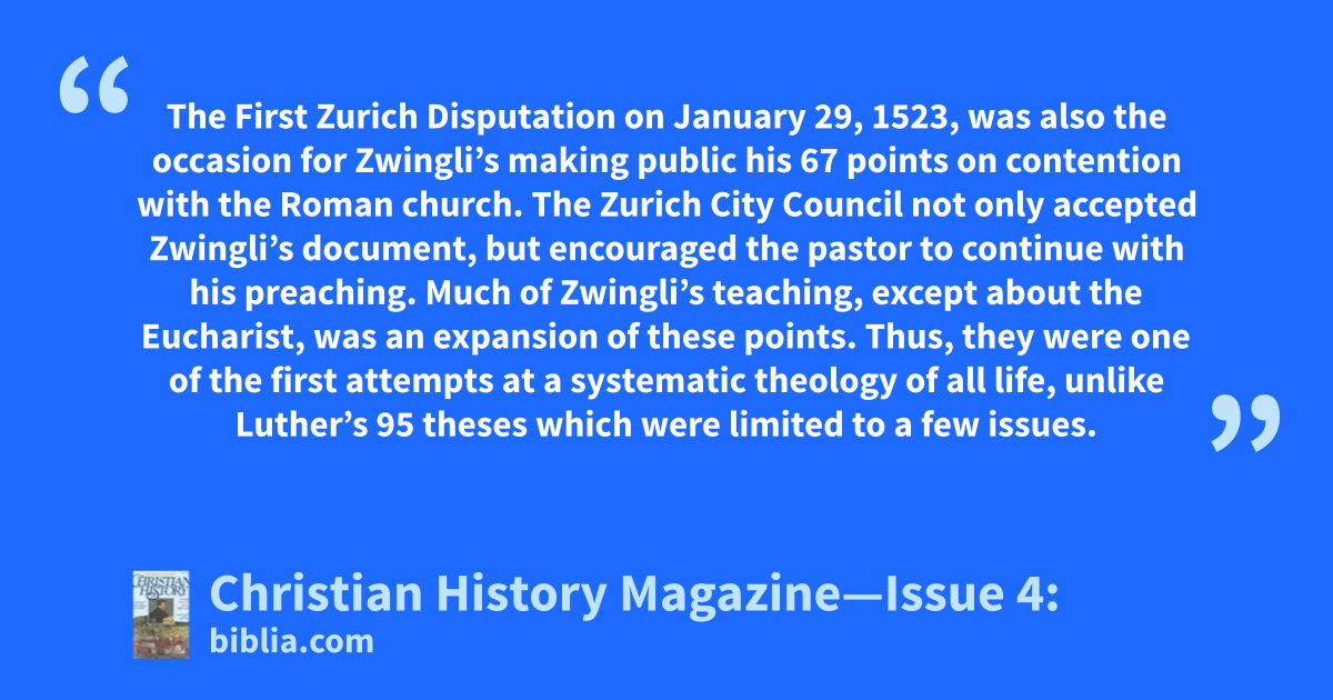 The First Zurich Disputation on January 29, 1523, was also the occasion for Zwingli’s making public his 67 points on contention with the Roman church. The Zurich City Council not only accepted Zwingli’s document, but encouraged the pastor to continue with his preaching. Much of Zwingli’s teaching, except about the Eucharist, was an expansion of these points. Thus, they were one of the first attempts at a systematic theology of all life, unlike Luther’s 95 theses which were limited to a few issues.