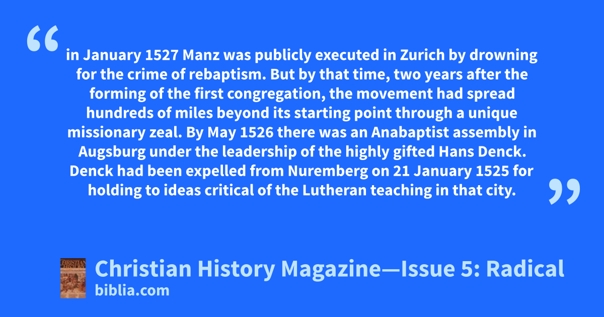 in January 1527 Manz was publicly executed in Zurich by drowning for the crime of rebaptism. But by that time, two years after the forming of the first congregation, the movement had spread hundreds of miles beyond its starting point through a unique missionary zeal. By May 1526 there was an Anabaptist assembly in Augsburg under the leadership of the highly gifted Hans Denck. Denck had been expelled from Nuremberg on 21 January 1525 for holding to ideas critical of the Lutheran teaching in that city.
