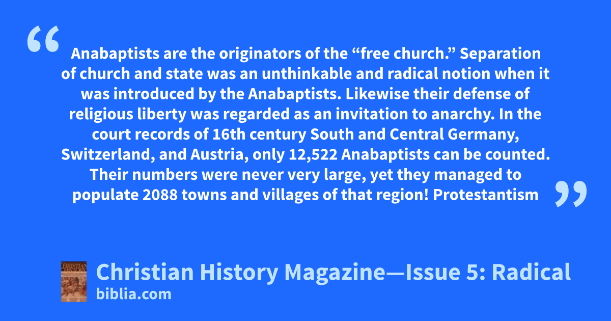 Anabaptists are the originators of the “free church.” Separation of church and state was an unthinkable and radical notion when it was introduced by the Anabaptists. Likewise their defense of religious liberty was regarded as an invitation to anarchy. In the court records of 16th century South and Central Germany, Switzerland, and Austria, only 12,522 Anabaptists can be counted. Their numbers were never very large, yet they managed to populate 2088 towns and villages of that region! Protestantism