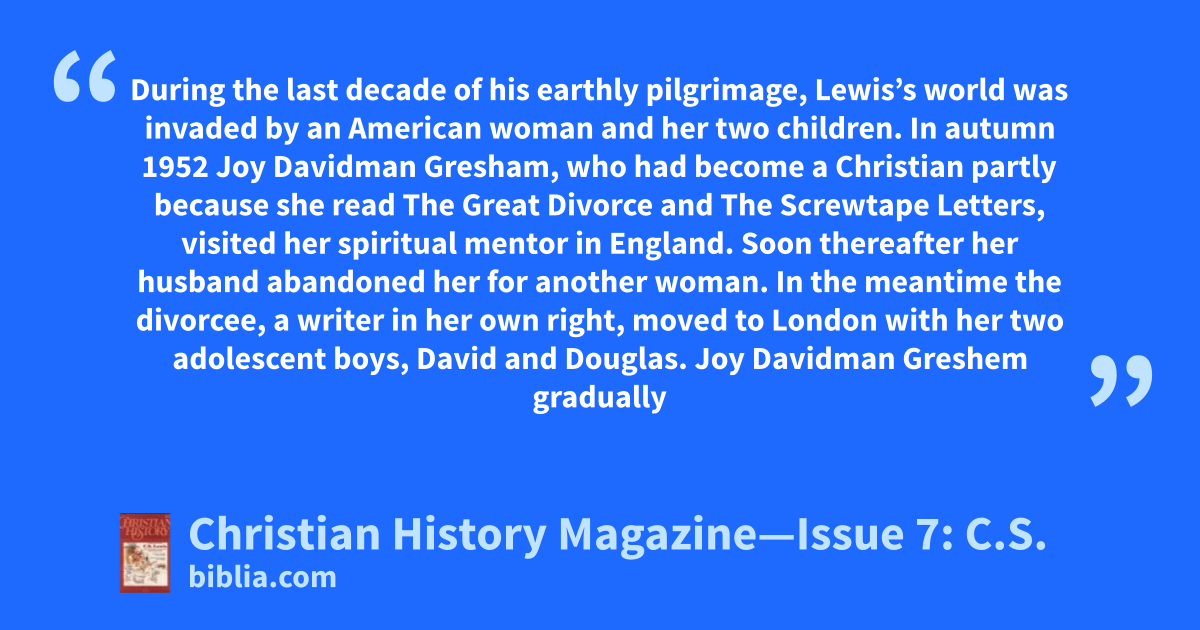 During the last decade of his earthly pilgrimage, Lewis’s world was invaded by an American woman and her two children. In autumn 1952 Joy Davidman Gresham, who had become a Christian partly because she read The Great Divorce and The Screwtape Letters, visited her spiritual mentor in England. Soon thereafter her husband abandoned her for another woman. In the meantime the divorcee, a writer in her own right, moved to London with her two adolescent boys, David and Douglas. Joy Davidman Greshem gradually