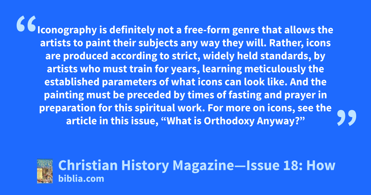 Iconography is definitely not a free-form genre that allows the artists to paint their subjects any way they will. Rather, icons are produced according to strict, widely held standards, by artists who must train for years, learning meticulously the established parameters of what icons can look like. And the painting must be preceded by times of fasting and prayer in preparation for this spiritual work. For more on icons, see the article in this issue, “What is Orthodoxy Anyway?”