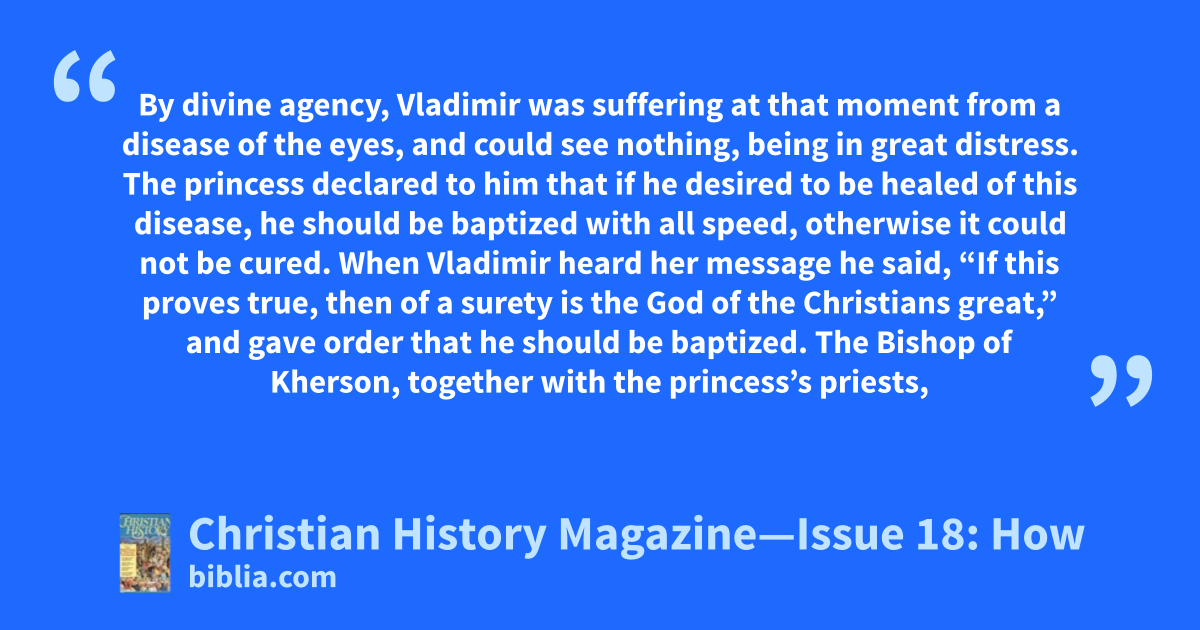 By divine agency, Vladimir was suffering at that moment from a disease of the eyes, and could see nothing, being in great distress. The princess declared to him that if he desired to be healed of this disease, he should be baptized with all speed, otherwise it could not be cured. When Vladimir heard her message he said, “If this proves true, then of a surety is the God of the Christians great,” and gave order that he should be baptized. The Bishop of Kherson, together with the princess’s priests,