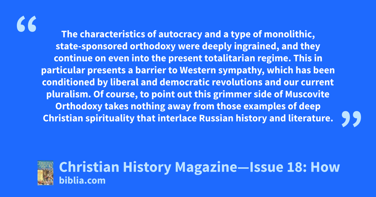 The characteristics of autocracy and a type of monolithic, state-sponsored orthodoxy were deeply ingrained, and they continue on even into the present totalitarian regime. This in particular presents a barrier to Western sympathy, which has been conditioned by liberal and democratic revolutions and our current pluralism. Of course, to point out this grimmer side of Muscovite Orthodoxy takes nothing away from those examples of deep Christian spirituality that interlace Russian history and literature.