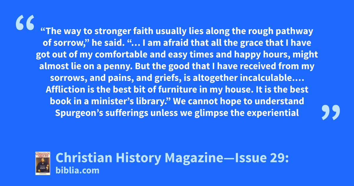 “The way to stronger faith usually lies along the rough pathway of sorrow,” he said. “… I am afraid that all the grace that I have got out of my comfortable and easy times and happy hours, might almost lie on a penny. But the good that I have received from my sorrows, and pains, and griefs, is altogether incalculable.… Affliction is the best bit of furniture in my house. It is the best book in a minister’s library.” We cannot hope to understand Spurgeon’s sufferings unless we glimpse the experiential