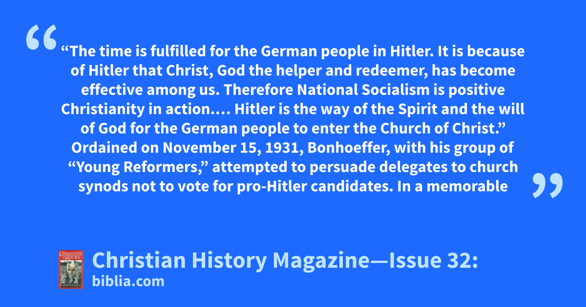 “The time is fulfilled for the German people in Hitler. It is because of Hitler that Christ, God the helper and redeemer, has become effective among us. Therefore National Socialism is positive Christianity in action.… Hitler is the way of the Spirit and the will of God for the German people to enter the Church of Christ.” Ordained on November 15, 1931, Bonhoeffer, with his group of “Young Reformers,” attempted to persuade delegates to church synods not to vote for pro-Hitler candidates. In a memorable