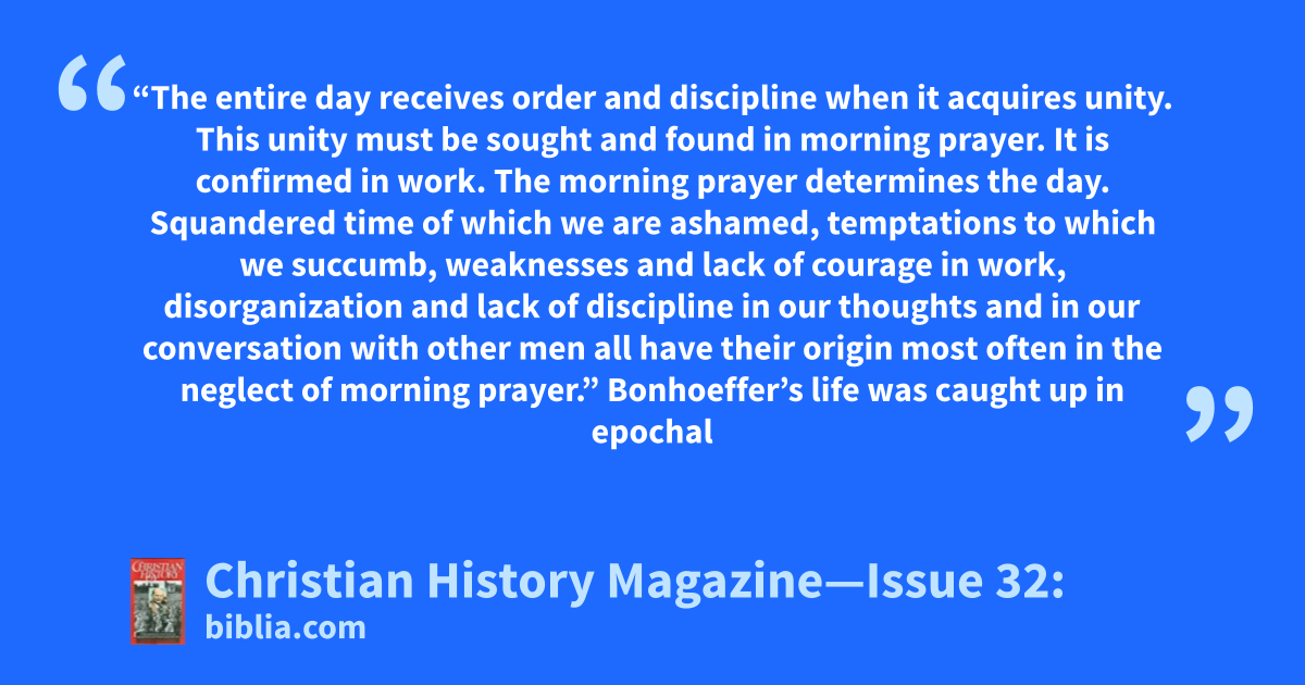 “The entire day receives order and discipline when it acquires unity. This unity must be sought and found in morning prayer. It is confirmed in work. The morning prayer determines the day. Squandered time of which we are ashamed, temptations to which we succumb, weaknesses and lack of courage in work, disorganization and lack of discipline in our thoughts and in our conversation with other men all have their origin most often in the neglect of morning prayer.” Bonhoeffer’s life was caught up in epochal