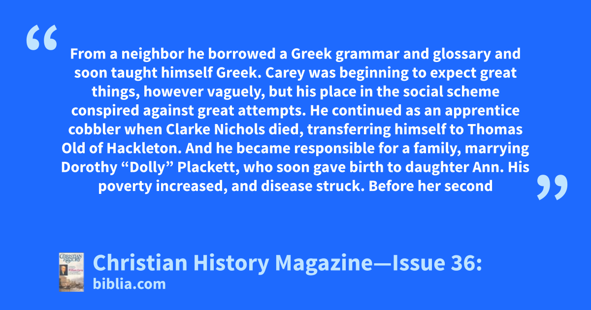 From a neighbor he borrowed a Greek grammar and glossary and soon taught himself Greek. Carey was beginning to expect great things, however vaguely, but his place in the social scheme conspired against great attempts. He continued as an apprentice cobbler when Clarke Nichols died, transferring himself to Thomas Old of Hackleton. And he became responsible for a family, marrying Dorothy “Dolly” Plackett, who soon gave birth to daughter Ann. His poverty increased, and disease struck. Before her second