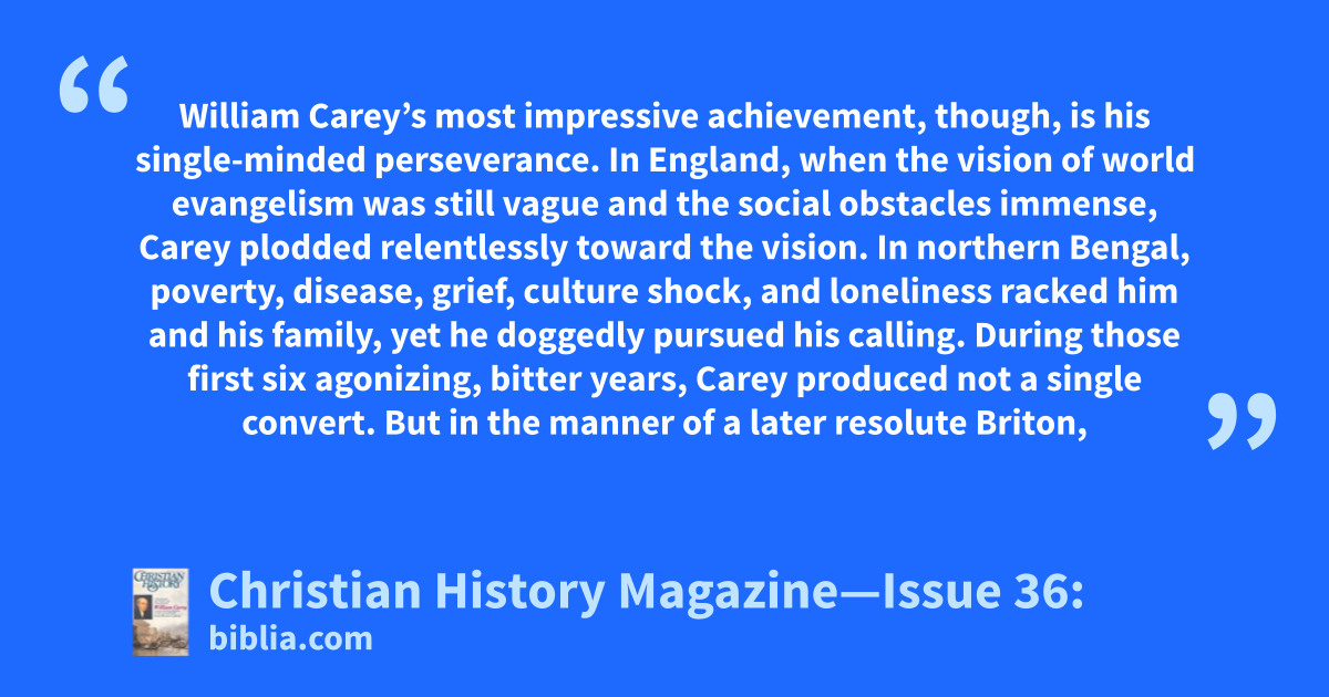 William Carey’s most impressive achievement, though, is his single-minded perseverance. In England, when the vision of world evangelism was still vague and the social obstacles immense, Carey plodded relentlessly toward the vision. In northern Bengal, poverty, disease, grief, culture shock, and loneliness racked him and his family, yet he doggedly pursued his calling. During those first six agonizing, bitter years, Carey produced not a single convert. But in the manner of a later resolute Briton,