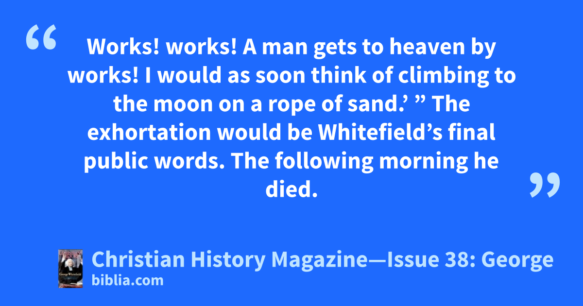 Works! works! A man gets to heaven by works! I would as soon think of climbing to the moon on a rope of sand.’ ” The exhortation would be Whitefield’s final public words. The following morning he died.