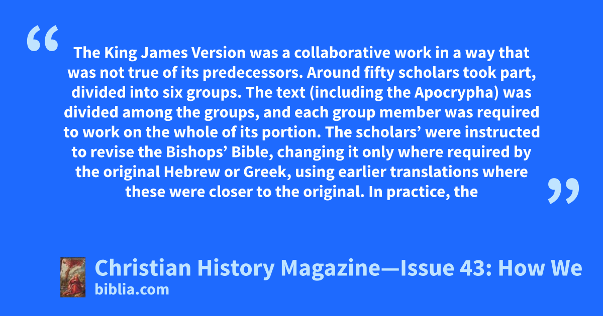 The King James Version was a collaborative work in a way that was not true of its predecessors. Around fifty scholars took part, divided into six groups. The text (including the Apocrypha) was divided among the groups, and each group member was required to work on the whole of its portion. The scholars’ were instructed to revise the Bishops’ Bible, changing it only where required by the original Hebrew or Greek, using earlier translations where these were closer to the original. In practice, the