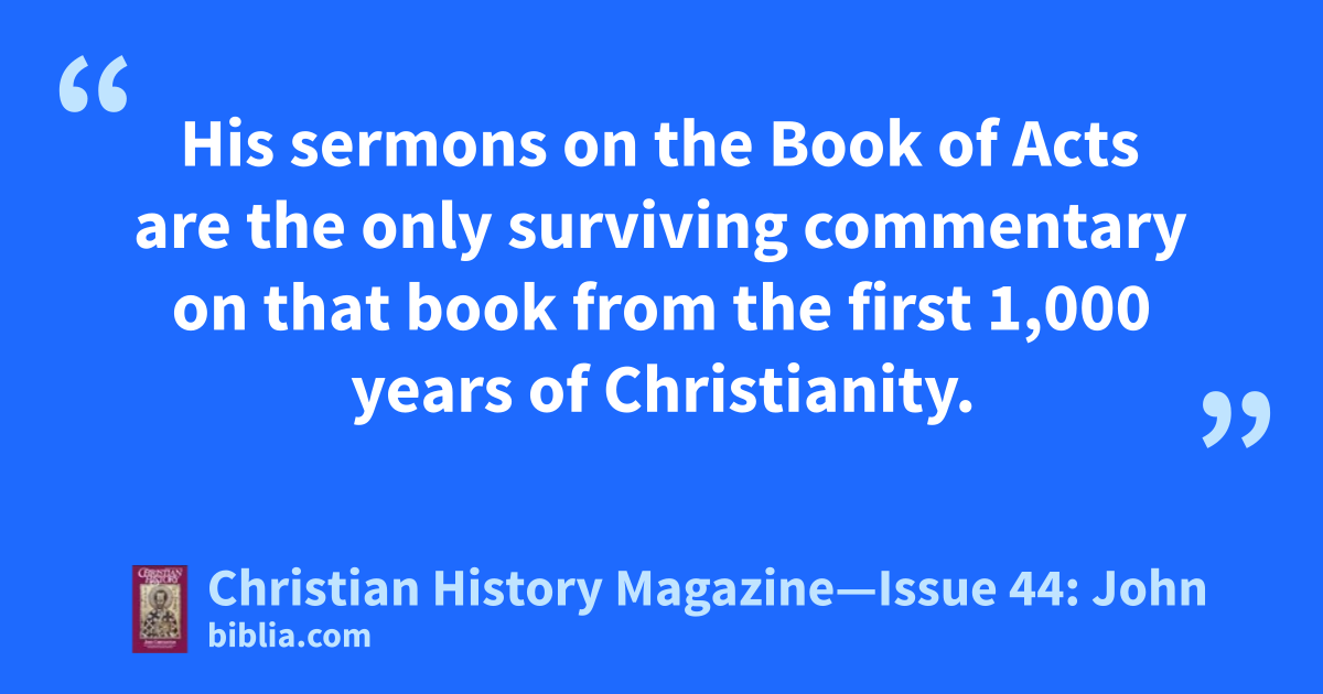 His sermons on the Book of Acts are the only surviving commentary on that book from the first 1,000 years of Christianity.