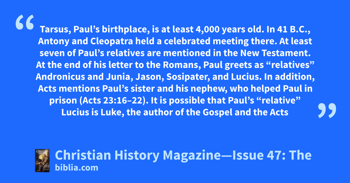 Tarsus, Paul’s birthplace, is at least 4,000 years old. In 41 B.C., Antony and Cleopatra held a celebrated meeting there. At least seven of Paul’s relatives are mentioned in the New Testament. At the end of his letter to the Romans, Paul greets as “relatives” Andronicus and Junia, Jason, Sosipater, and Lucius. In addition, Acts mentions Paul’s sister and his nephew, who helped Paul in prison (Acts 23:16–22). It is possible that Paul’s “relative” Lucius is Luke, the author of the Gospel and the Acts