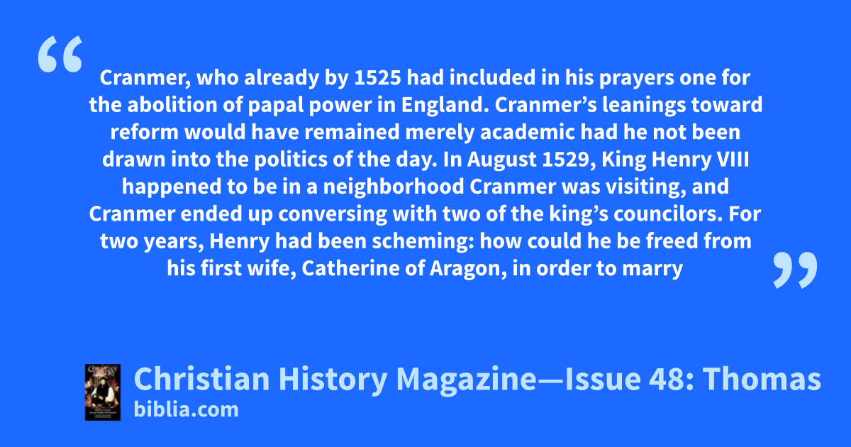 Cranmer, who already by 1525 had included in his prayers one for the abolition of papal power in England. Cranmer’s leanings toward reform would have remained merely academic had he not been drawn into the politics of the day. In August 1529, King Henry VIII happened to be in a neighborhood Cranmer was visiting, and Cranmer ended up conversing with two of the king’s councilors. For two years, Henry had been scheming: how could he be freed from his first wife, Catherine of Aragon, in order to marry