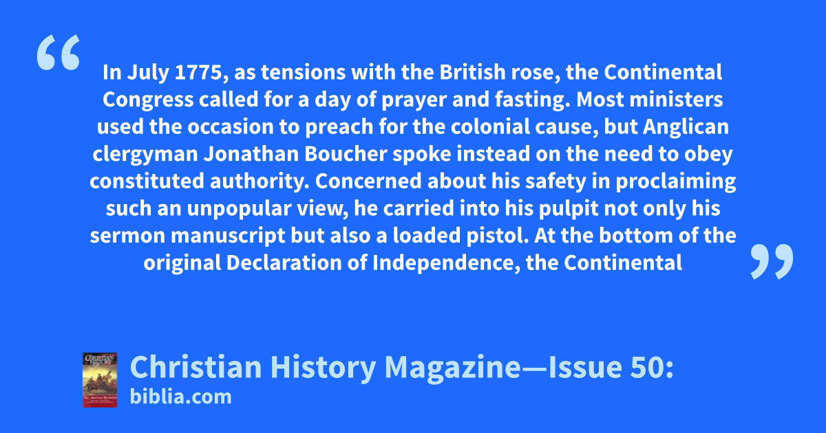 In July 1775, as tensions with the British rose, the Continental Congress called for a day of prayer and fasting. Most ministers used the occasion to preach for the colonial cause, but Anglican clergyman Jonathan Boucher spoke instead on the need to obey constituted authority. Concerned about his safety in proclaiming such an unpopular view, he carried into his pulpit not only his sermon manuscript but also a loaded pistol. At the bottom of the original Declaration of Independence, the Continental
