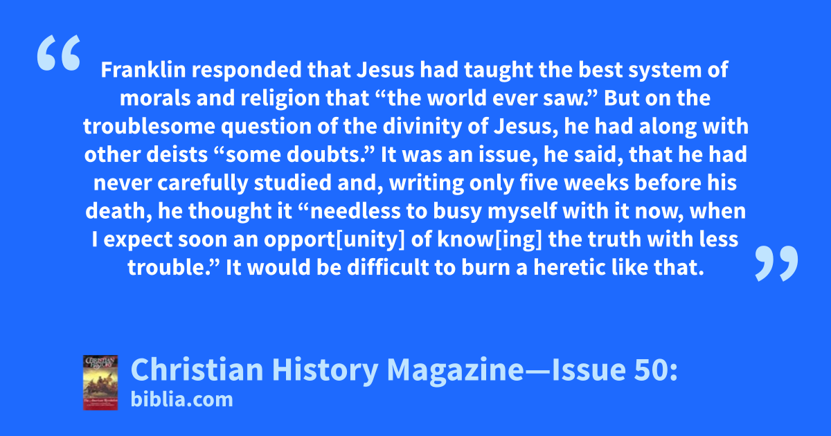 Franklin responded that Jesus had taught the best system of morals and religion that “the world ever saw.” But on the troublesome question of the divinity of Jesus, he had along with other deists “some doubts.” It was an issue, he said, that he had never carefully studied and, writing only five weeks before his death, he thought it “needless to busy myself with it now, when I expect soon an opport[unity] of know[ing] the truth with less trouble.” It would be difficult to burn a heretic like that.